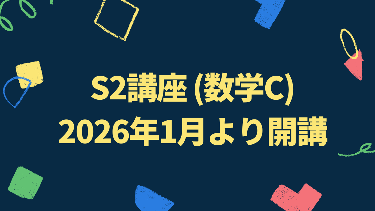S2講座(数学C)が開講されます 未分類 2025.11.02 2025年1月実施の共通テストから新課程に移行し,数学では新しく「複素数平面・二次曲線」を選択解答できるようになりました.これまで理数研KSEでは,「複素数平面・二次曲線」は理系の受講生だけに講義してきましたが,文系の受講生も学べるように次の通りテキストを変更しました.・S2講座(2026年1月〜3月):数C[複素数平面・二次曲線](文理共通)・S3講座(2026年4月〜12月):数Ⅲ[極限・微分・積分](理系専用)「複素数平面・二次曲線」を学んでおくことは,理系はもちろんのことながら,文系の受講生にとっても共通テストでは有利になるので,主に高校2年生を対象に,S2講座の受講をお勧めします.お申し込みはお電話(0798-69-0232)もしくは事務室まで直接お越しください. 詳細は,PDF資料をご覧ください.> 高校2年生の方へ(M2/S2講座のお知らせ).pdf